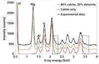 To demonstrate the feasibility of the analysis of a whole rock specimen, a limestone was chosen because of its simple mineralogy. In Figure 6 the spectrum of the limestone experimental data is compared to the results of two model simulations, which are a pure calcite (CaCO3) and an 80:20 mixture of calcite and dolomite, (CaMg[CO3]2). The O-, Mg-, Al-, and Si-labeled peaks are caused by fluorescence from the corresponding elements, but the regions highlighted by the dotted boxes demonstrate the detection of dolomite as the secondary mineral in this sample (21).