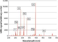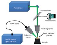 LIBS is an atomic emission spectroscopic technique that uses a small plasma generated by a focused pulsed laser beam (typically from a Nd:YAG laser) as the emission source. The plasma formed is about 10× hotter than an inductively coupled plasma and as a result will vaporize just about any material it comes in contact with. The energy from the plasma excites the vaporized sample, which results in a characteristic emission spectrum of the elements present in the sample, which is then optically dispersed and detected by optical components traditionally used in an emission spectrometer (24). A typical optical layout of a LIBS system is shown in Figure 7. Figure 8 exemplifies a generated emission spectrum.