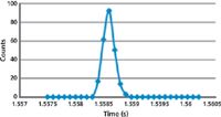 Each peak represents the instrumental response for each integration point. If one of these time-resolved peaks is examined closely, as shown in Figure 3, it can be seen that the gold nanoparticle has been generated in <1 ms, showing the need for a very fast data acquisition rate, using short dwell and settling times for this kind of work. Ideally, for the measurement of nanoparticles, the ICP-MS system should be capable of using dwell times of 100 μs or less so the pulse can be fully characterized. Additionally, for single-element studies, some instruments offer a modification to the measurement protocol to run with no settling time to ensure that the maximum number of nanoparticle pulses is detected during the rapid transient event. However, if this capability is not an option, very short settling times on the order of 50 μs are required.