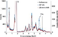 To assess the applicability of this approach, a proof-of-concept experiment was carried out to demonstrate its feasibility. This is exemplified in Figure 5, which shows the spectral data of a pressed-powder pellet of quartz, mounted at two different arbitrary distances from the detector, and also tilted by 45°. The high degree of consistency between the three spectra demonstrates the irrelevance to sample distance and orientation, except for an overall intensity factor. The peaks labeled Si and O are caused by fluorescence, while all the other remaining peaks are caused by diffraction, except for those labeled 55Fe, which arise from the inadvertent exposure of a calibration source.