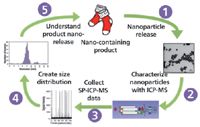 In this example, nano-Ag imbedded in athletic socks, which is used as a bactericide, has been shown to release during simulated wash cycles (step 1). By collecting and analyzing a simple aqueous solution with the ICP-MS system (step 2), and collecting data using the single-particle ICP-MS technique (step 3) the size, concentration, and associated dissolved material can be quantified — all of which are important parameters in environmental and biological modeling. After the raw data is collected, the dissolved content is at low signal intensity, with nanoparticles creating pulses above this background where the height of the pulse relates to the mass of analyte and the number of pulses correlates to the concentration of nanoparticles in the samples. The size distribution of particles in the sample can be calculated using well-understood single-particle ICP-MS theory (step 4). A histogram of nanoparticle diameter versus the number of events (nanoparticle number) can then be created to visualize the nanoparticle distribution in the sample, in addition to calculating the concentration of both the nanoparticles and dissolved fractions of the nanoparticle released from the products (step 5). The theory of size distribution will not be discussed here, but with this technique, scientists can have a better understanding of how nanomaterials will behave in the environment at realistic concentrations.