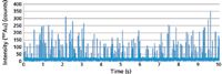 However, for this approach to work effectively at low concentrations, the speed of data acquisition and the response time of the ICP-MS detector must be fast enough to capture the time-resolved nanoparticle pulses, which typically last less than 1 ms. If the electronics are not fast enough, two or three pulses can easily pass through and be erroneously detected as a single pulse. Figure 2 shows a real-world example of the time-resolved ICP-MS analysis of a mixture of 30-nm and 60-nm gold particles together with 5 ppb gold in solution (9).