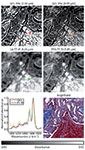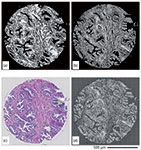 An emerging understanding of the fundamentals of IR image formation (19–21) has revealed the importance of correct spatial sampling to retrieve a fully resolved image, only limited by diffraction. Specifically, decreasing the pixel size to a value of ~1.1 µm (at 3950 cm-1) provides an optimal tradeoff between quality and speed. As opposed to the previously used 5.5–6.25 µm pixels, measurements at significantly higher densities are termed HD and were first shown using 12 defocused synchrotron beams to cover a 128×128 focal plane array (FPA) detector, reaching a pixel size of 0.54 µm (16). The use of a brighter synchrotron source was crucial as it allowed light to be better used with a high numerical aperture (NA) lens and allowed the acquisition of high S/N data in a time comparable to laboratory instruments. The smaller pixels imply a reduction in intensity compared to low NA–low magnification optics that can be mitigated by increasing the detector integration time, by better optical design, and by the use of mathematical noise rejection post-acquisition in laboratory HD systems. There are two major configurations at present-a thermal source (21) in a benchtop Fourier transform infrared (FT-IR) spectrometer where the sampling objective is either a 74× (NA = 0.65) or a 15× objective (NA = 0.65) with an additional 5× magnification optic just before the FPA detector (18,22,23). The combination of better optical design (22,23) and the use of numerical methods for noise rejection has now allowed both HD and high quality data in a reasonable amount of time. An example is shown in Figure 1, in which HD imaging of lymph nodes is shown to provide high quality histopathologic information that provides morphologic detail close to that obtained by conventional optical microscopy.