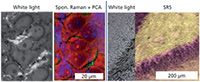 The close correspondence to spontaneous spectra plus the linear relationship between concentration and measured signal means that SRS is uniquely suited to truly discrete-frequency approaches analogous to the DFIR examples discussed previously. An interesting comparison can be seen between SRS and QCL-IR imaging in Figure 3. It can be seen that both technologies produce an excellent fidelity and detailed view of biological tissue. Although the signal-to-noise ratio of the QCL system is much higher, providing for better contrast, the resolution of the SRS system is superior, providing for more spatial detail. In both cases, the image of this biological tissue does not require the use of dyes or stains and provides sufficient quality to perform studies. Just as HD-IR advantages are becoming clear in emerging studies, the near future will likely provide a number of applications of detailed histopathology with SRS imaging. Given the two-photon origin of the signal in SRS, the optical sectioning of tissue in 3D will always be superior and provide detail in depth scanning applications, which are ultimately limited by scattering-induced loss of signal. Because this technology holds the potential to continue driving discrete-frequency approaches in Raman imaging, it is useful to highlight the different ways in which narrow-band or limited bandwidth SRS has been implemented.