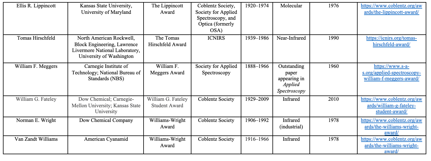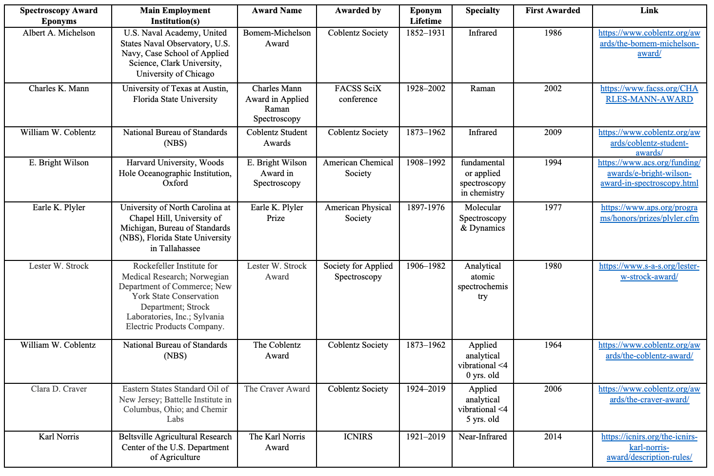 Table I: A list of the major eponym spectroscopy awards (in award name alphabetical order)