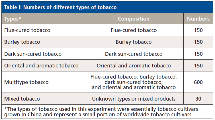 All the experimental samples of different tobacco types were collected at the Beijing Third Class Tobacco Supervision Station within a three-year period and are shown in Table I.