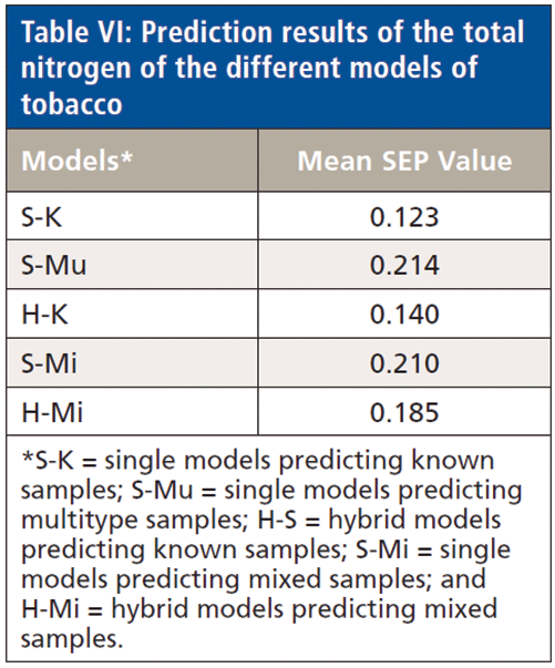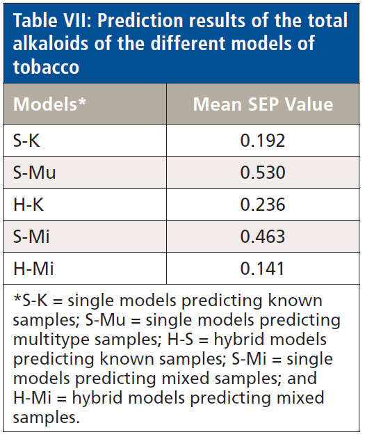 The external prediction of the single and hybrid quantitative calibration models for total nitrogen and total alkaloids was carried out by using the 30 validated samples. The predictive results of the different quantitative NIR analysis models for total nitrogen and total alkaloids are shown in Tables IV and V; the results are reported as SEP values. The prediction results of total nitrogen from the different models of tobacco are shown in Tables VI and VII; the results are reported as the means of the SEP. Among these models, S-K, S-Mu, H-S, S-Mi, and H-Mi represent single models predicting known samples, single models predicting multitype samples, hybrid models predicting known samples, single models predicting mixed samples, and hybrid models predicting mixed samples, respectively.