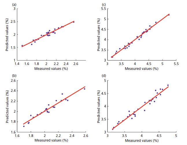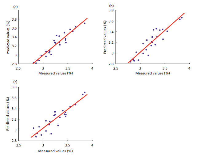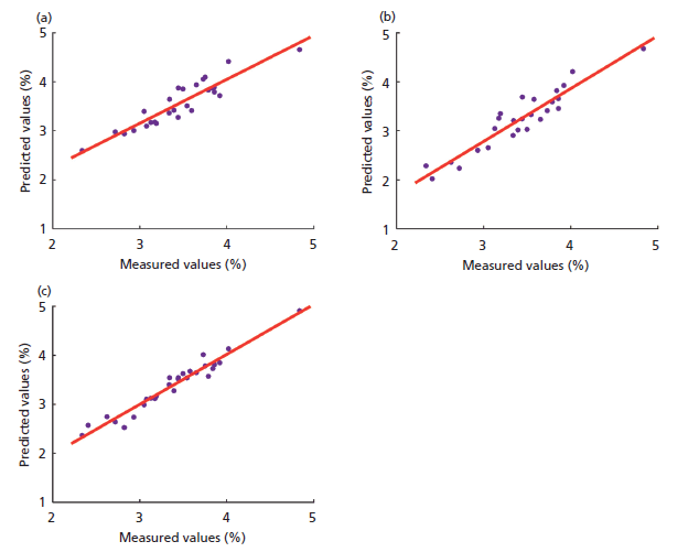 As shown in Figures 1–4, the total nitrogen and total alkaloids of the different tobacco types were concentrated on both sides of the line, and a high degree of analysis accuracy occurred with respect to the relationship between the measured values and the predicted values of the verification sets. Figures 1 and 3 show that the predictive effect of the single models is clearly better than that of the hybrid models. By contrast, Figures 2 and 4 show that the hybrid models constructed in this study have a wider predictive range for predicting mixed samples.