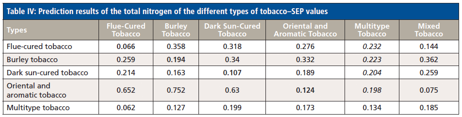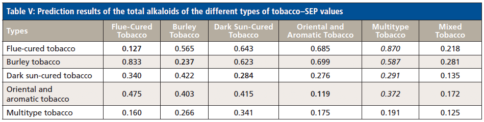 As shown in Tables IV and VI, in the forecast of the quantitative model of the total nitrogen content in the different types of tobacco (the data in the table are bold and italicized), the single models can predict known samples of total nitrogen. The SEP values of flue-cured tobacco, burley tobacco, dark sun-cured tobacco, and oriental and aromatic tobacco were lower than those of the single models predicting multitype samples, demonstrating that the S-K models are better than the S-Mu models. Further, the error rate for predicting total nitrogen was reduced by 42.5% and for total alkaloids by 63.8%, indicating that single models could predict only known samples but not mixed samples.