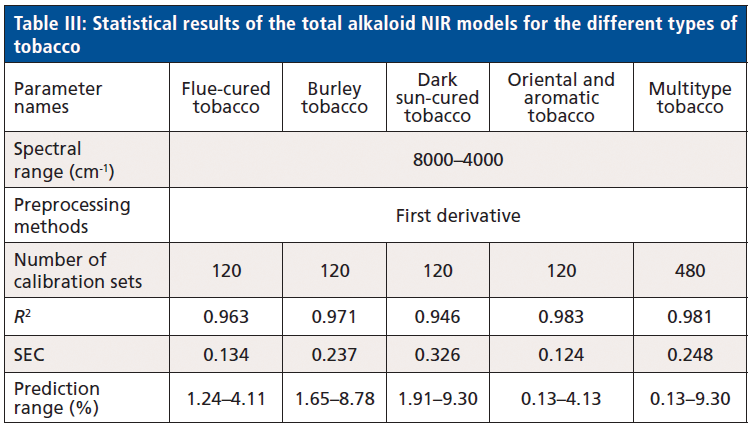Both tables show that the R2 of the quantitative NIR models of total nitrogen and total alkaloids among flue-cured tobacco, burley tobacco, dark sun-cured tobacco, oriental and aromatic tobacco, and multitype tobacco were greater than 0.90; the SEC values of the calibration sets were lower than 1; and the calibration models had better predictive ability.