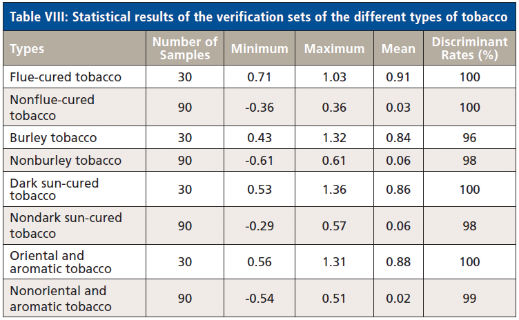 Table VIII shows that the discriminant rates of the different tobacco types were all above 95%, effectively improving the prediction accuracy of the quantitative NIR analysis. These results also confirm that significantly improving the accuracy of plant regression and quantitative NIR analysis methods is difficult.