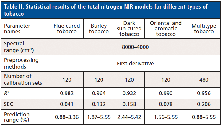 For each type of tobacco, 150 samples were collected. Based on the distribution of total nitrogen and total alkaloid concentrations, 120 samples were selected for the modeling set, and the remaining samples (comprising 30 samples of mixed tobacco) were used for the validation set. Summaries of the statistical analysis results of the partially optimized PLS of the models of the different tobacco types for the total nitrogen and total alkaloid contents are shown in Tables II and III.