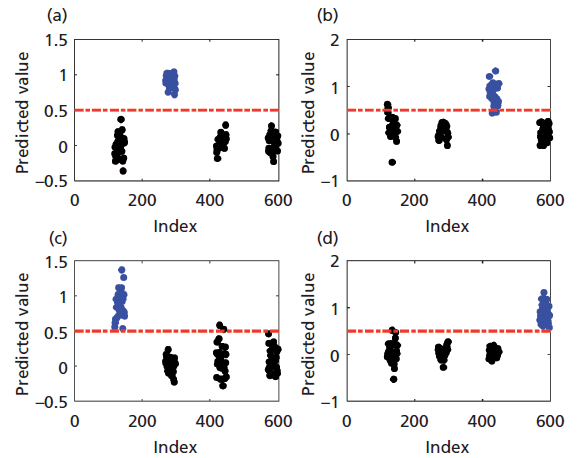 Figure 5: Prediction results based on PLS-DA of the various tobacco types: (a) flue-cured tobacco, (b) burley tobacco, (c) dark sun-cured tobacco, and (d) oriental tobacco.