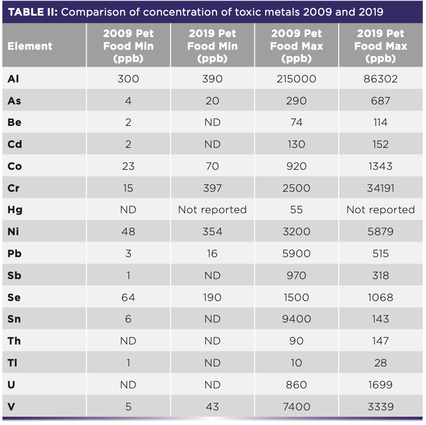 In the decade since the first heavy metals study, the FSMA was created. Pet food fell under the direction of the FDA within the FSMA, and it was our hope that public awareness of the previous pet food regulatory shortfalls would be corrected and lower metal content would now be seen in pet food.