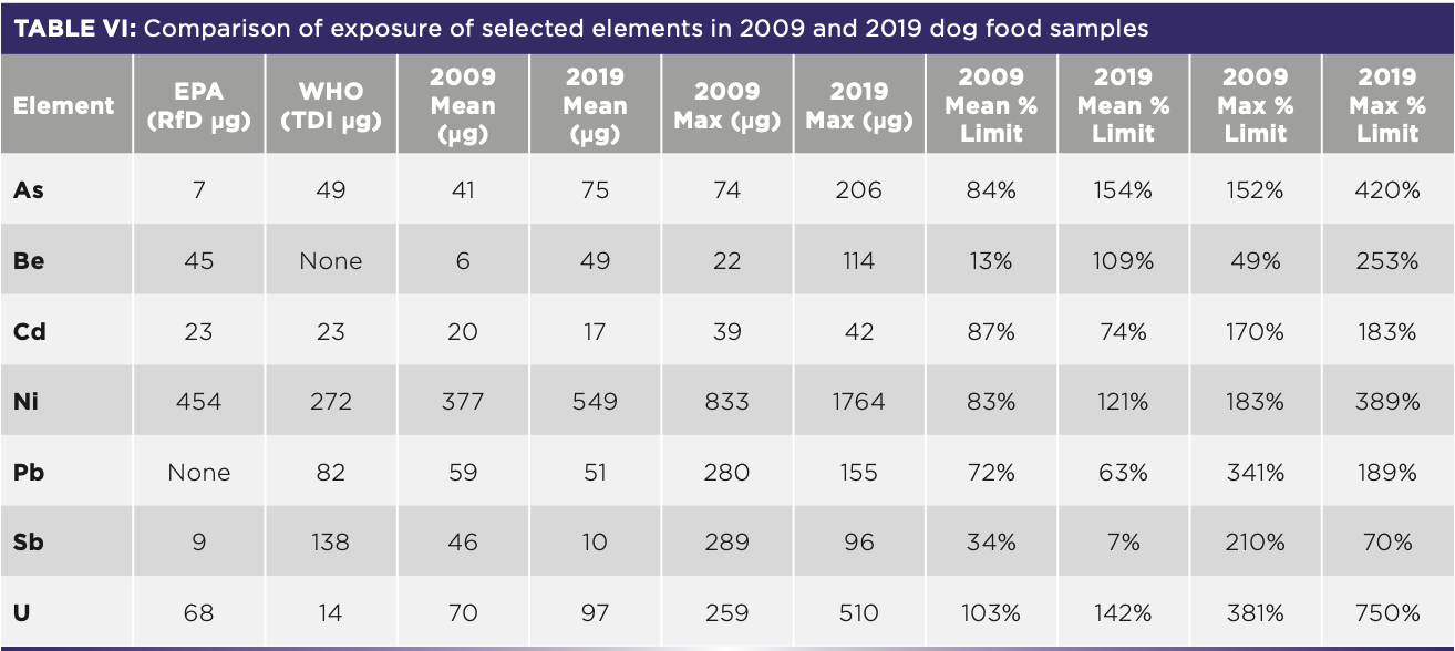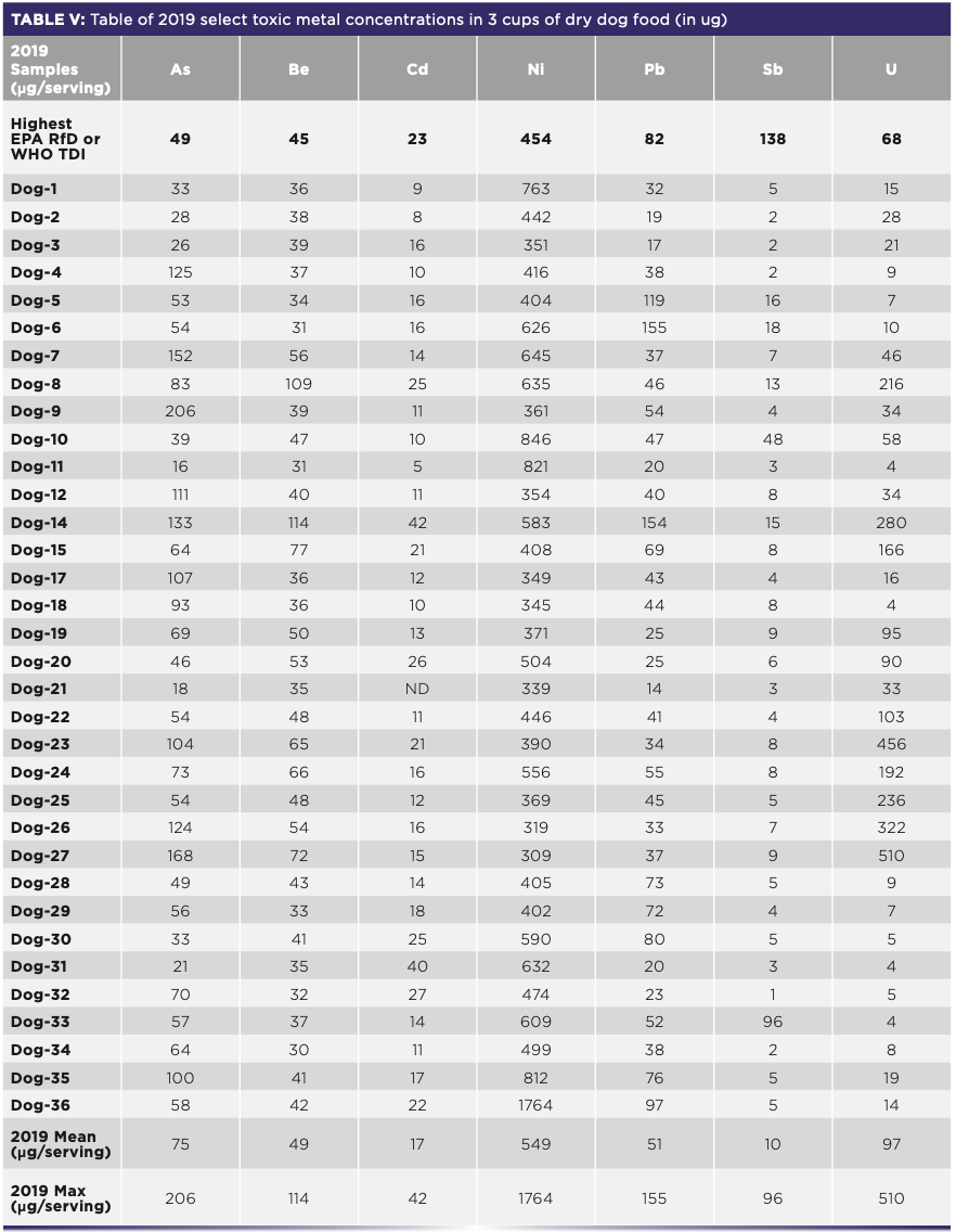 The 2019 samples results were calculated for a serving of three cups of dry dog food intended for a 50-lb dog (Table V) and compared to calculated limits (Table III). Mercury results were not included in 2019 data because of technical issues.