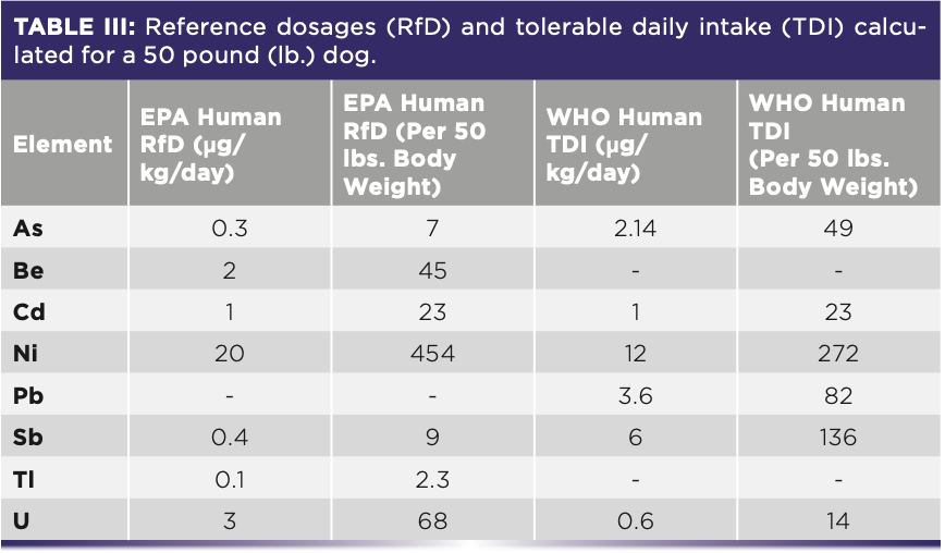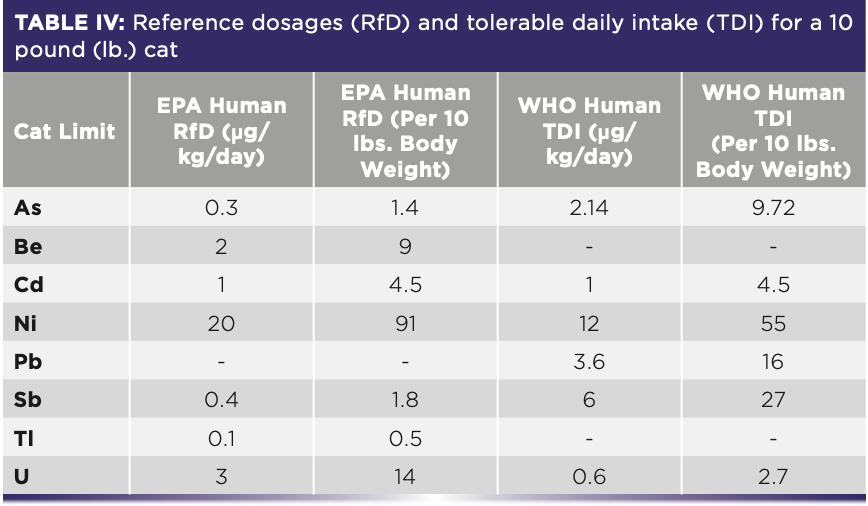 During the interim between studies, the 2011 FSMA was implemented. In the act, there was further guidance on the safety of pet food, but, again, no limits were expressed for heavy metals or toxic elements in pet food so updated human limits from the WHO and the EPA were used as guidelines. Reference daily dosages (RfD) and tolerable daily intake (TDI) for the pets were calculated (Tables III and IV) to estimate exposure from the various foods tested.