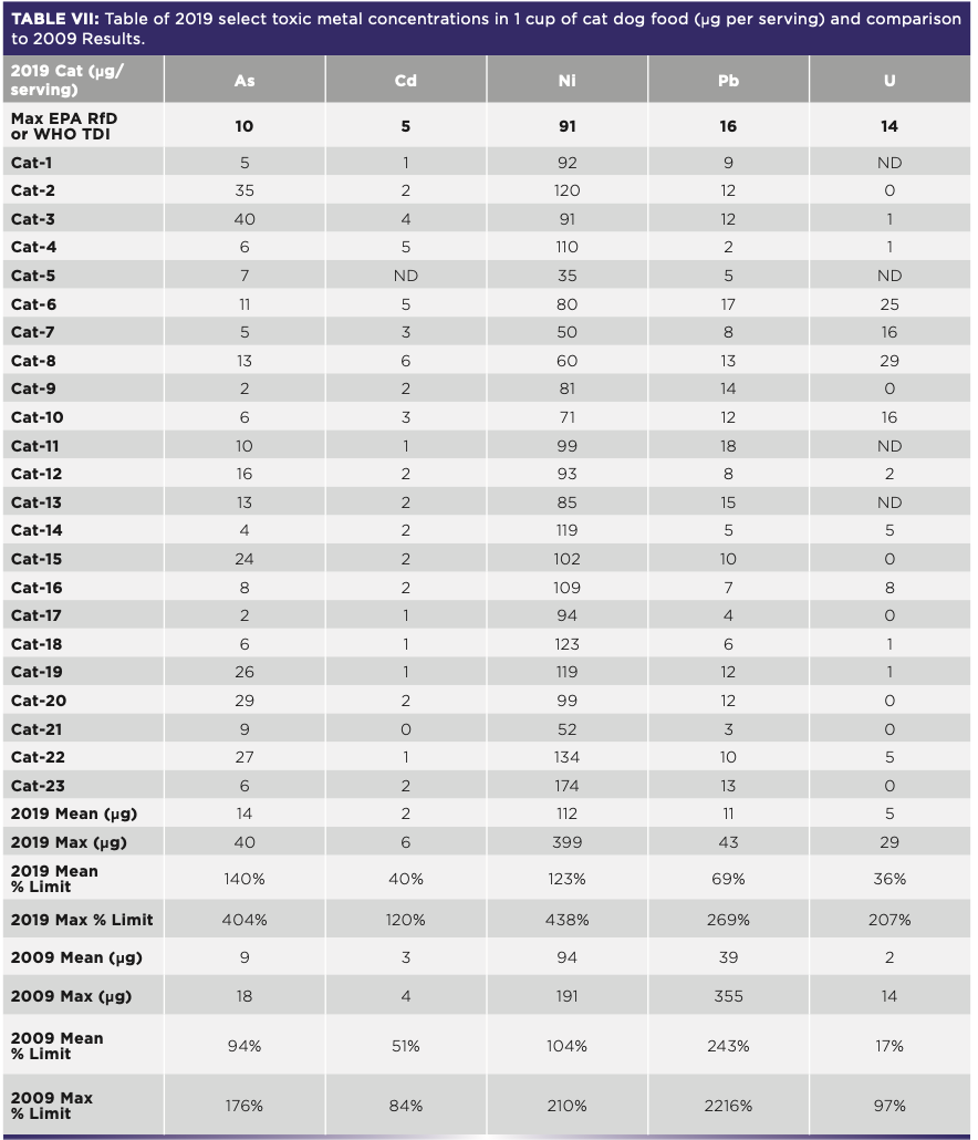 Cat food, similar to dog food, found increases in concentrations of trace elements from 2009 to 2019. The total number of samples with levels that exceeded limits increased as did the overall concentrations of elements, such as arsenic, nickel, and uranium. The majority of cat food samples had arsenic levels above the WHO TDI. The highest samples contained over 400% the limit. As was found in the dog food, lead levels were slightly lower in the 2019 samples compared to the 2009 data, as seen in Tables VII.