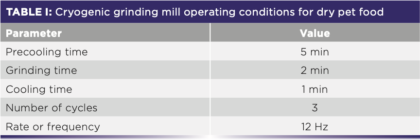 Dry cat and dog food samples (10–15 g) were ground to a uniform powder in a cryogenic mill (SPEX SamplePrep 6875D Large Dual Freezer/Mill with 6885 mid-size Poly-Vial). Operating conditions are shown in Table I.