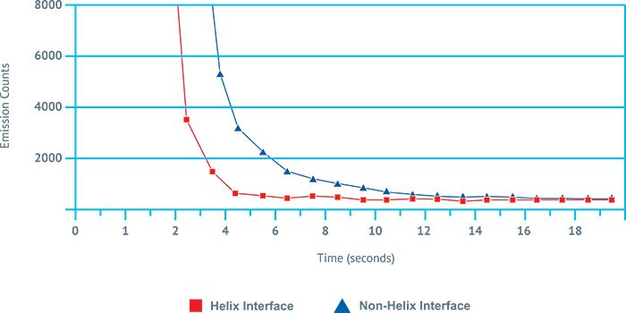 The Helix CT is the only nebulizer-spray chamber interface that significantly reduces the dead volume around the nebulizer. This unique design minimizes washout time with highly concentrated samples, reducing sample-to-sample carryover and improving sample throughput. Figure 2 compares the time required to washout a 10 ppm Molybdenum standard with the Helix CT interface and a "Brand-X" spray chamber with an o-ring interface. The results show that with the Helix nebulizer interface a 10 ppm standard can be washed out in as little as 4 s, whereas "Brand-X" takes 16 s. One can expect this time to significantly increase for more troublesome or "sticky" elements that are more prone to carryover issues.