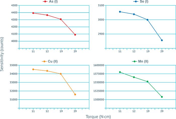 Glass Expansion's new Helix CT design maintains the positive stop of the original Helix to ensure that the nebulizer is inserted to the correct and optimum depth within the spray chamber. In addition to nebulizer depth, the torque applied to the nebulizer seal is also critical. The data shown in Figure 3 highlights the effects of torque applied to the nebulizer seal versus the observed sensitivity. The applied torque was increased incrementally from 11 N·cm to 29 N·cm. As the torque applied to the nebulizer seal increases, the sensitivity decreased on average by 5%, with greatest difference being 8% (Cu II). The new Helix CT locking screw is set to the optimum torque and will seal the PressFit PTFE ferrule against the nebulizer to the same torque each day. This allows your ICP to achieve the same nebulizer performance every day.
