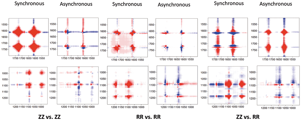 In order to extract more insight into the behavior of this material, Figure 3 will show the 2D-COS plots (both synchronous and asynchronous) for the ZZ vs. ZZ spectra (left), the RR vs. RR spectra (middle), and then the ZZ vs. ZR (right) in the aromatic/carbonyl region (top), and in the region of the carbon-carbon and carbon-oxygen single bond stretches and bends (bottom). For each set, the plots on the left are the synchronous plots, and those on the right are the asynchronous plots. Note that red means an increase in signal, and blue a decrease. The three sets of plots are showing very different behavior, and these differences have specific information in them. We will comment on some of what the ZZ vs. ZZ and RR vs. RR plots say, and then focus on the ZZ vs RR.