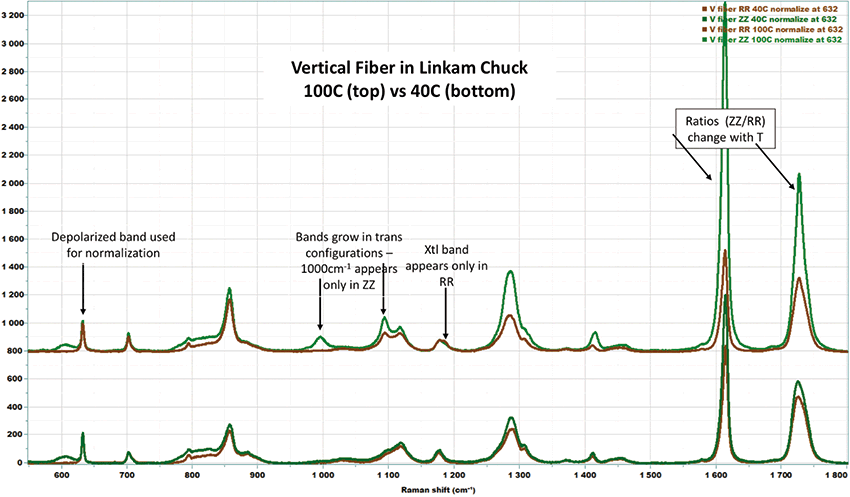 Figure 2 shows the ZZ and RR spectra of the fiber held in the chuck and measured at 40 °C (bottom) and 100 °C (top). It is known that the response of the instrument will be better when the light is polarized normal to the grating grooves, which means normal to the slit, so a scrambler is mounted between the microscope and the entrance slit for all measurements to correct for the grating dichroism. A half wave plate was mounted in the laser entry path in order to control the orientation of the laser polarization. Because there can be some drift during the time that the temperature is raised, the alignment was checked routinely, but, just as importantly, all spectra were normalized so that the intensity in the 632 cm-1 band was identical in all spectra.