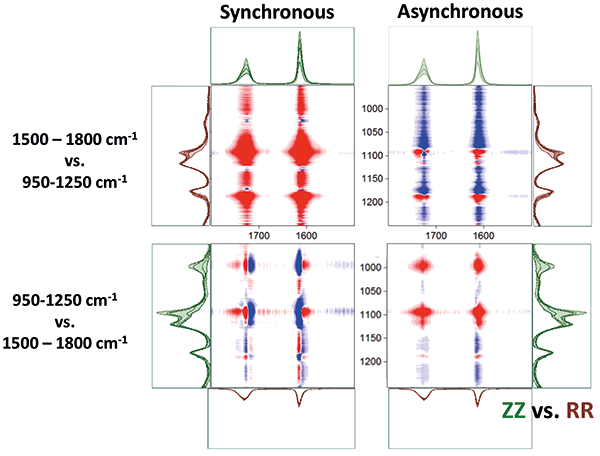 Curiously, the point at (1615, 1615) cm-1 in the synchronous plot is blue (negative). That is because as the ZZ intensity is increasing, the RR intensity is going down. The intensity of the crystalline phase at (1725, 1725) cm-1 is increasing (red), while that at (1725, 1720) cm-1 is blue, which means that the amorphous RR contribution is decreasing relative to the ZZ.