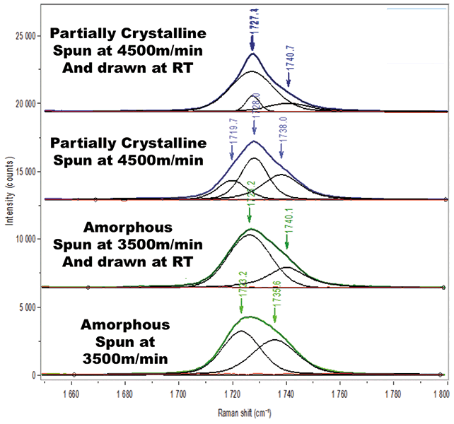 Figure 1: Band-fitted ZZ spectra (from bottom to top) of amorphous fiber spun at 3500m/min, same fiber drawn at room temperature, fiber spun at 4500m/min (partially crystalline), and then the same fiber drawn at RT.