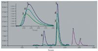 Another advantage is illustrated in Figure 2b. Here, settings in the data processing software were configured to return a nonzero trace only if signals from both an unmetabolized steroid and its hydroxylated metabolite correlate within a flow-injection peak. Requiring the presence of both parent and metabolite increases the confidence of positive results, and can allow these positive results to be easily spotted amongst a long series of injections.