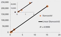 Quantitative results are listed in Table I. Figure 7 shows the unweighted least squares model for the lowest four levels of the stanozolol standard curve. Similar to a typical MRM analysis, the enhanced extracted ion chromatogram shows high selectivity and a robust linear correlation.