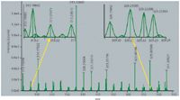 Figure 6 shows the deconvolved spectra of three coeluting steroids: oxandrolone, which fragments extensively at 60 V collision offset; methandrostenolone, which yields a few intense fragments at 60 V collision offset; and 3-hydroxystanozolol, which yields no measureable fragments at 60 V collision offset. Note that the oxandrolone and methandrostenolone signals are completely deconvolved from the 3-hydroxystanozolol spectra. Also, note that both oxandrolne and methandrostenolone yield intense fragments of nominal m/z 121. In a typical QqQ analysis, this could lead to cross-talk. However, high-resolution MS easily distinguishes these two fragments that represent a formula difference of CH4 vs. O.