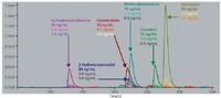 Figure 4b shows the deconvolved precursor ion and product ion spectra of stanozolol. Fragmentation of the presucor in a manner such as that observed here (and common among sterols) can make derivation of selective MRM transitions challenging. Comprehensive fragmentation allows all product ions to be monitored simultaneously, then combined together by data processing to yield an enhanced signal. This is not time-dependent nor is there a limit to the number of fragments to be correlated with a precursor ion. In addition, unlike MRMs, the product ions may in fact be correlated with one another to create signal enhancement in the chromatogram. Further enhancement in S/N is achieved by requiring selected precursor and product ions to be concurrently present before a nonzero signal is returned. Figure 5 shows the resultant enhanced extracted ion chromatograms for six steroids.