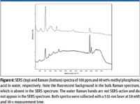 Methyl phosphonic acid is a hydrolysis product of nerve agents (VX, GB, GD, and GF), and is an example of the use of this technique for detection of nerve agent by-products. The Raman and SERS spectra of methyl phosphonic acid at 40 wt% and 100 ppm in water, respectively, are shown in Figure 6.