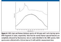 Detection of DNA fragments is another application of high-throughput trace analysis. Figure 8 compares the Raman and SERS spectra of herring sperm DNA fragments (50–200 base pairs) at 5 wt% and 100 ppm in water, respectively. Here, the spectra differences are dramatic. In the case of the 5 wt% sample, only fluorescence is observed, which completely obscures any Raman spectral features that might be present. In contrast, the SERS spectrum, which contains some fluorescence, clearly shows evidence of nucleotides, such as the adenine peak at 735 cm-1.
