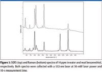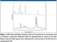 Next, benzoic acid, which represents a functional group common to many drugs, was examined. A similar comparison of the Raman to SERS spectra for benzoic acid in methanol at 10 wt% (105 ppm) to 10 ppm, respectively, is displayed in Figure 4.