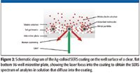 The 96-well SERS-active microtiter plates (Real-Time Analyzers, Inc., Middletown, Connecticut) consisted of ~1-mm thick coating of a patented (10) silver-doped sol-gel chemistry on glass bottom microtiter plates (Greiner Bio-One, VWR, Bridgeport, New Jersey). The height of the microplate was adjusted to bring the SERS coating into the focal point of the laser, as shown schematically in Figure 2. Approximately 100–200 μL of each analyte in solution was added to individual SERS-active wells for analysis. The analytes were allowed to diffuse passively into the porous sol-gel and the immobilized silver particles.