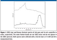 Figure 7 compares the Raman and SERS spectra of ampicillin at 10 wt% and 100 ppm in water, respectively. Measurement of potential drug entities or their activity, such as this antibiotic, are common applications of high-throughput screening. In addition to the absence of the strong water peak centered at 3330 cm-1 in the SERS spectrum, it appears that both the carboxylic acid peak at 1600 cm-1 and the C-N peak at 2100 cm-1 are enhanced substantially.