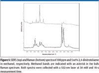 An example of trace explosive detection is shown in Figure 5, which compares the Raman to SERS spectra of 2,4-dinitrotoluene at 5 wt% and 100 ppm in methanol, respectively. Again the methanol peaks are marked with an asterisk.