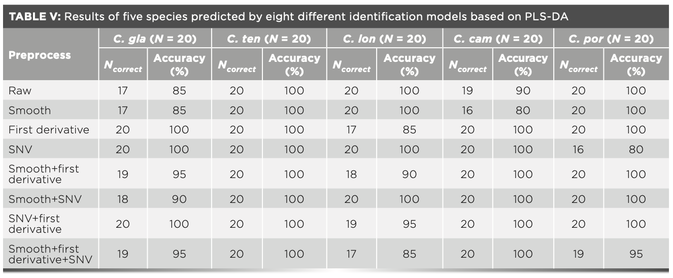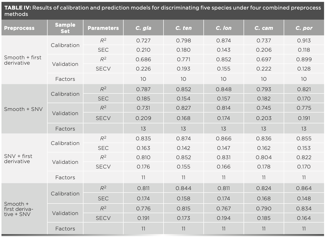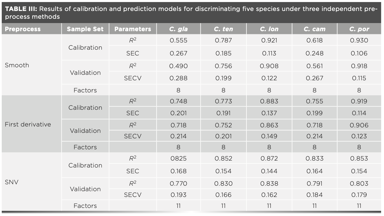 The results of calibration and prediction models for discriminating five species under three independent preprocess methods are shown in Table III. First, in contrast to the model created by raw spectra the R2c value of five species were decreased in the model created by the smooth preprocessed spectra.