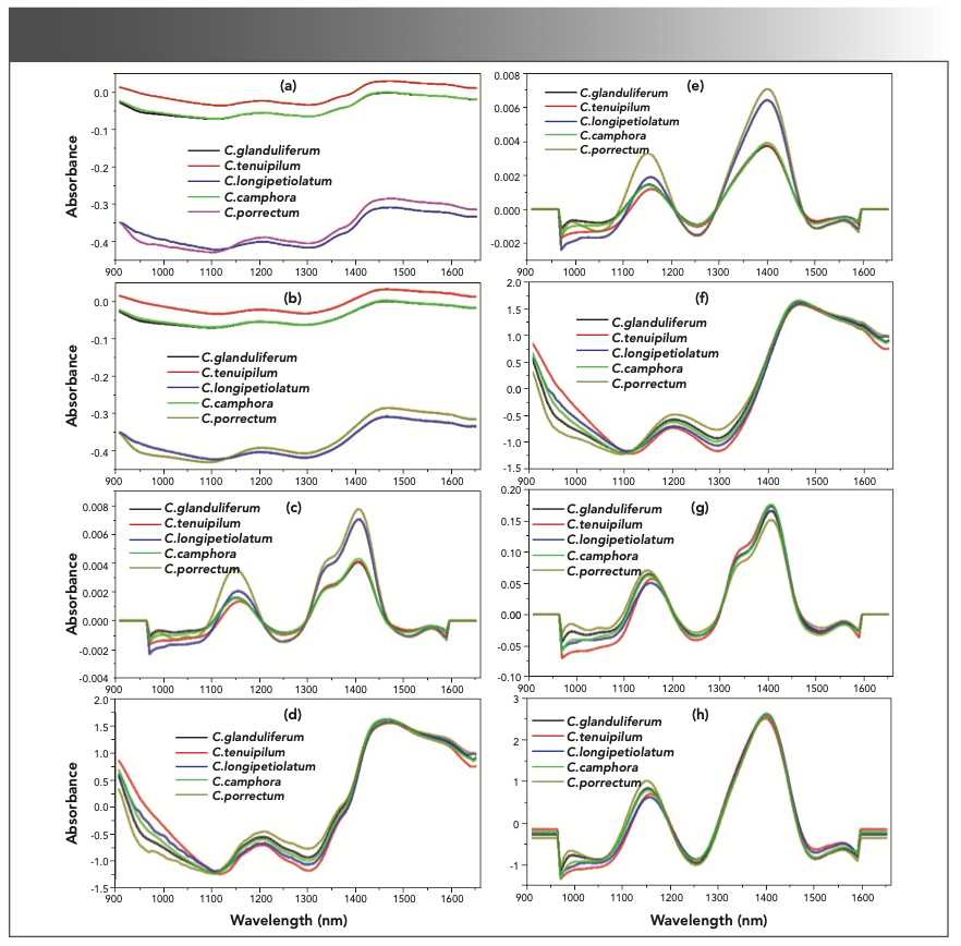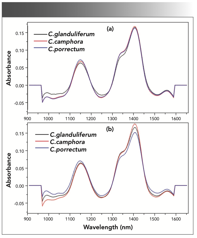 Some anatomy research involving Cinnamomum (Lauraceae) has been conducted (4,5,6). The results have shown that the wood structure was homogeneous among genera (4,7). As a result, it is difficult to determine wood species immediately on-site even for a skilled inspector. Although some advancement has occurred in wood species identification auxiliary technology, a device that could identify wood species rapidly and on-site at the species level has long been desired. Near-infrared (NIR) spectroscopy has been investigated as a reliable technique for identifying some wood species, but it has not been tested for the Cinnamomum species. NIR spectroscopy is a nondestructive, fast, and cost-effective analytical technology (8), and an NIR instrument combined with multivariate analysis is a useful tool not only for the quantification but also for the qualification of wood species (9).