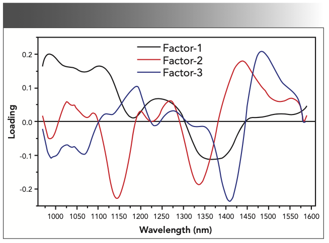 Scaled loading plots of first three factors of the spectra preprocessed by SNV and first derivative combine (factor 1 has a proportion of variance 83%; factor 2 has a proportion of variance 9%; and factor 3 has a proportion of variance 5%) are shown in Figure 2, which is a plot of X-loading weights for all the components compared to the variable number. If a variable has a large positive or negative loading weight, this means that the variable is important for the component concerned. If a variable has the same sign for all the important components, it is most likely to be an important variable. The highest accuracy was obtained in the model created by spectra preprocessed using SNV and first derivative (Table V). As a result, the loading plots of the first three factors (had a greater contribution to model) of the spectra preprocessed by SNV and first derivative combined was analyzed (Figure 2). From the point of view of factor 1, there existed significant peaks at approximately 982–1106 nm. For factor 2, the main absorptions were at 1025, 1267, and 1434 nm, and the important peaks were approximately 1186 and 1484 nm for factor 3.