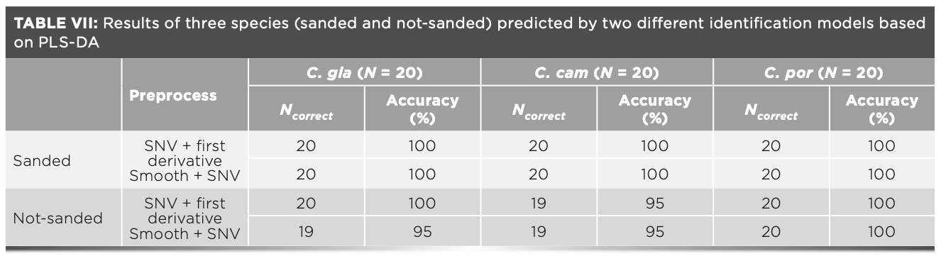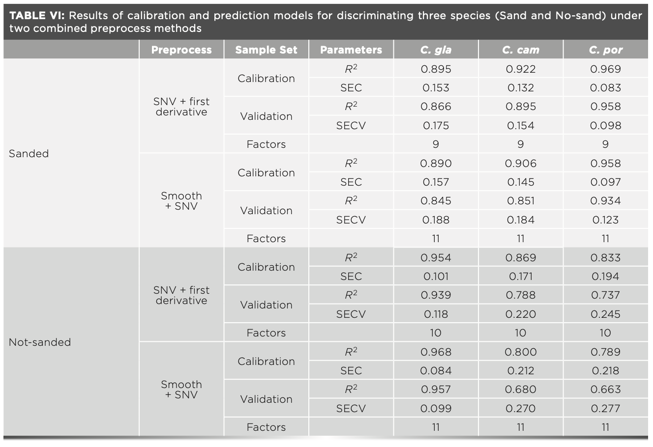 The results of calibration and prediction models for discriminating three species, sanded and not-sanded samples, under two combined preprocess methods (SNV and first derivative, smoothing and SNV) are shown in Table VI. It can be seen that the ing and SNV) are shown in Table VI. It can be seen that the R2c value of sanded samples were above 0.895, and the R2c value of not-sanded samples were above 0.833 for the model based on spectra preprocessed by SNV and first derivative combined. The R2c value of the sanded samples were above 0.890, and the R2c value of not-sanded samples were above 0.789 for the model based on spectra preprocessed by smoothing and SNV combined; the sanded sample provided better results than the unsanded (raw) sample. The identification results of unknown samples from three different species, sanded samples, and not-sanded samples using two types PLS-DA models were presented in Table VII. For the sanded samples, all samples were identified correctly for the two models. 100% accuracy was attached for all sanded samples. For the not-sanded samples, one sample of Cinnamomum camphora was misclassified into other species for the model created by the spectra preprocessed by SNV and first derivative combined, and one sample of Cinnamomum glanduliferum and one sample of Cinnamomum camphora were misclassified into other species for the model created by the spectra preprocessed after smoothing and SNV combined. The accuracy was 95% for not-sanded samples. Although two types of models are created from the spectra obtained from sanded and not-sanded specimens; samples that were sanded produced higher accuracy models in wood species identification using portable NIR technology.