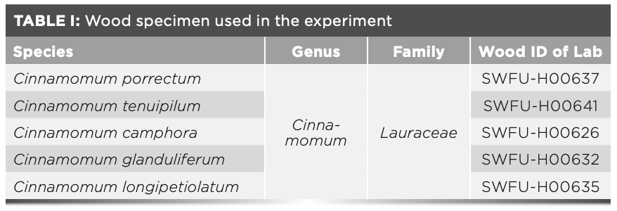 In this work, five Cinnamomum species (Cinnamomum porrectum, Cinnamomum tenuipilum, Cinnamomum camphora, Cinnamomum glanduliferum, and Cinnamomum longipetiolatum) were harvested from the wood herbarium of the Southwest Forestry University (Table I). For this study, 30 specimens with no defect were selected for each species. The specimens used were cut from different parts of the tree. The average size of the specimen is around 75 mm × 10 mm × 45 mm, and the total number of the specimens was 150. Prior to spectral measurement, two cross-sections were sanded with grit for each specimen. In addition, three species (Cinnamomum glanduliferum, Cinnamomum camphora, and Cinnamomum porrectum) were selected, and the spectra were obtained before and after sanding the sample surface.