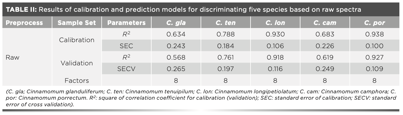 Table II shows the optimal number of factors for each model suggested by the software Unscrambler v10.4. (Note the c and p superscripts denote calibration and prediction, respectively.) The results of calibration and prediction models for discriminating five species based on raw spectra were quite poor: the R2c value was only 0.634 for Cinnamomum glanduliferum and 0.683 for Cinnamomum camphora. This result demonstrated the performance of the model based on raw spectra may not be enough for five species identification.