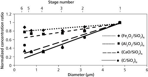Coal has also been measured using the same experimental procedure and parameters with the temperature correction method. Concentration ratios of Fe2O3/SiO2, Al2O3/SiO2, and CaO/SiO2 were similar for different stages. However, C/SiO2 decreased when reducing the particle diameter (3). One reason for these results is the variation of mineral matter during the coal grinding process, which means the contents of different species are uneven in fine particles. From our results, we conclude that LIBS can quantitatively measure size-segregated particles according to diameter with the temperature correction method.