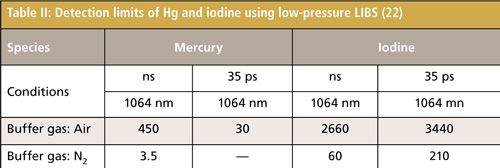 Figure 6 shows the concentration dependence of the iodine signal intensity in N2 (23). The results suggest the linear growth of I-3 signal intensity. The iodine detection limit of 600 shots (1 min) in N2 was estimated by evaluating the ratio of the slope of the iodine signal calibration curve (ms) to the background noise (standard deviation: Ï). The detection limit of iodine was 60 ppb (3Ï/ms) using nanosecond breakdown at 700 Pa. The background emission around I-3 at 183 nm was not eminent and the iodine detection limit was mainly determined by the detector noise in N2. Therefore, there was no evident enhancement of detection limits using short pulse width breakdown. The detection limit of iodine in air became worse because of the high quenching rate of excited iodine in O2. The Hg detection limit of 600 shots (1 min) was also estimated. The detection limits of iodine and Hg measured by low pressure LIBS are summarized in Table II.