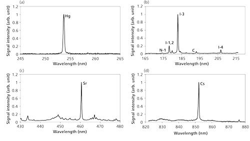 There are several interferences with the target signals in the LIBS process, generally including the continuum emission from plasma itself, coexisting molecular and atomic emissions, and noise from detectors. The laser-induced plasma process can be controlled by pressure, which relates to the interference and signal emissions. The interference of the continuum emission from plasma itself was reduced when the pressure decreased and the emissions of target elements became eminent compared with other emission signals by the control of electron impact ionization process. Figure 5 shows the measurement results of Hg, CH3I, Sr(C5[CH3]5)2, and Cs(C11H19O2) in N2 at low pressure (22). The apparent signals of Hg at 253.7 nm, iodine at 183 nm (I-3), Sr at 460.7 nm, and Cs at 852.1 nm can be detected with little interference of continuum emission and coexisting materials.