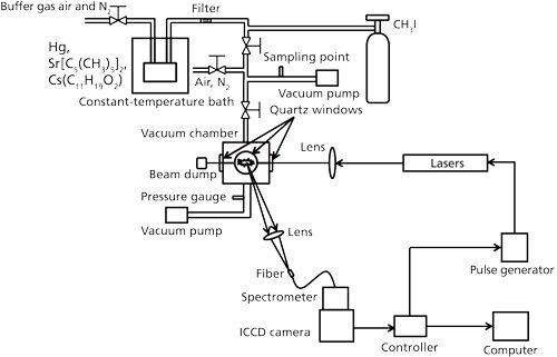 The schematic diagrams of the experimental system for trace species measurement is illustrated in Figure 2. Hg, CH3I, Sr(C5[CH3]5)2, and Cs(C11H19O2) were measured to evaluate the elemental detection characteristics of Hg, I, Sr, and Cs. The standard CH3I gas and the gaseous mixtures of Hg, Sr(C5[CH3]5)2, and Cs(C11H19O2) from the constant-temperature bath according to the vaporizing pressure with buffer gases of air and N2 were introduced into the measurement chamber. Four different pulsed Nd:YAG lasers were used here including nanosecond laser 1 (Quantel Brilliant b, 6 ns, beam diameter: 9 mm), nanosecond laser 2 (Quanta-Ray Pro-230, 6–12 ns, beam diameter: 9 mm), picosecond laser 1 (EKSPLA SL312, 150 ps, beam diameter: 10 mm), and picosecond laser 2 (Quantel YG901C-10, 35 ps, beam diameter: 9.5 mm). The output laser beam was focused into the measurement chamber using the lens with a focal length of 80 mm. Emission signals from another window of the chamber, perpendicular to the laser propagation direction, were finally detected by a combination of a spectrometer (JASCO CT-10S), an ICCD camera (Princeton Instruments Inc., Model ITEA/CCD-576-S/RB-E), and auxiliary equipment.
