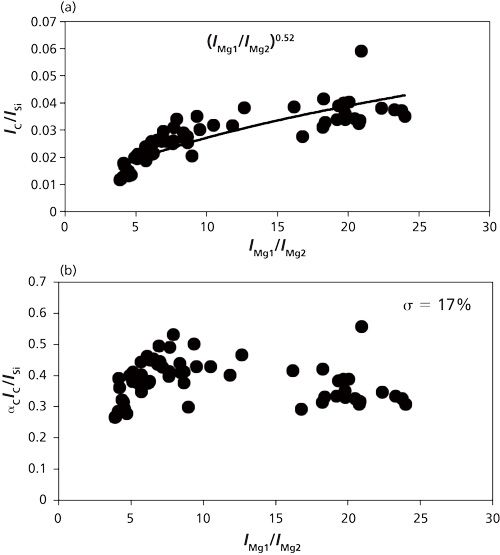 Plasma temperature correction is important for quantitative measurement. The fly ash and coal samples were measured to set up the plasma temperature correction factors under different experimental conditions such as delay time. The intensity with respect to species concentration varied with different delay times, which results in the alteration of the plasma temperature. The ratio of IMg1/IMg2 was used as the plasma temperature correction factor. A fly ash sample was measured for the temperature correction. IMg1/IMg2 was altered in the 4–24 range by changing the delay time between 800 and 3000 ns. IMg1/IMg2 increased with a decrease of the delay time. The typical temperature correction curve and temperature correction result of IC/ISi for IMg1/IMg2: 4–24 are shown in Figure 3. In Figure 3a the ratio is influenced by the plasma temperature, which is directly related to IMg1/IMg2. By applying the temperature correction scheme (20), the fluctuation of IC/ISi became smaller under different plasma temperature conditions, as shown in Figure 3b. However, the plasma temperature dependencies are apparently different for IMg1/IMg2: 4–8, which means the low plasma temperature condition, and IMg1/IMg2: 12–24, the high plasma temperature condition. This result means that the plasma induced by the LIBS process is not uniform and complex. LTE can be assumed in the limited range of plasma temperature-that is, IMg1/IMg2. The limitation of LTE assumption has also been discussed for glow discharge plasma (21).