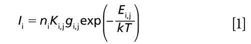 where Ii is the emission intensity of species i, ni is the concentration of species i, Ki,j is a variable that includes the Einstein A coefficient from the upper energy level j, gi,j is the statistical weight of species i at the upper energy level j, Ei.j is the upper level energy of species i, k is the Boltzmann constant, and T is the plasma temperature. Equation 1 is applicable under the conditions of local thermodynamic equilibrium (LTE). Actually, the plasma temperature intrinsically fluctuates causing the fluctuation of evaluated concentrations from LIBS signal intensities. Therefore, the plasma temperature correction becomes important to ensure the quantitative measurement, especially for particle measurement in gases. The plasma temperature correction method was proposed to improve the quantitative capability of LIBS (3). Different spectral lines from the same species were selected to correct the plasma temperature dependence of the emission intensity.